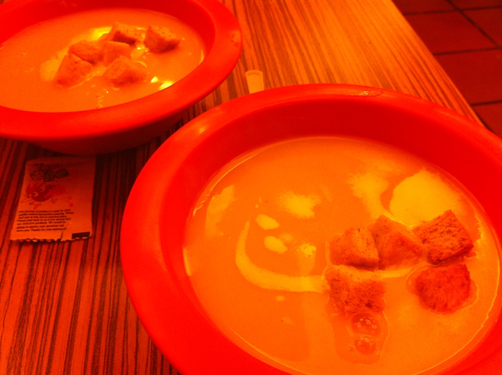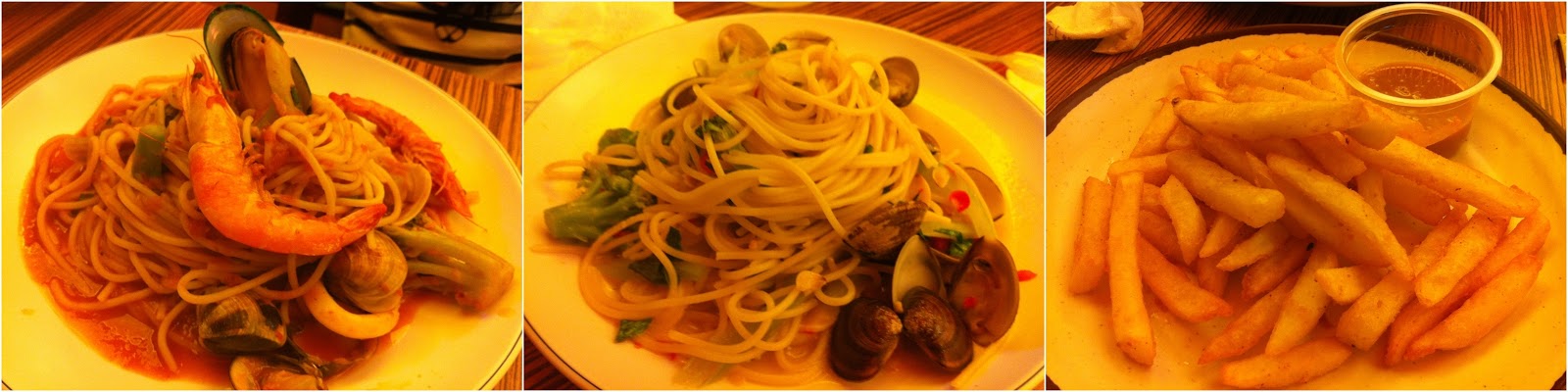 點了威尼斯海鮮義麵、白酒橄欖蛤蠣義麵、炸薯條,套餐附南瓜湯